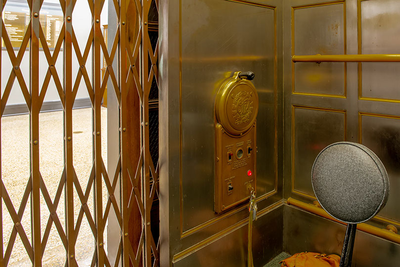 Three elevator cabs, one of which is still operated by attendants.