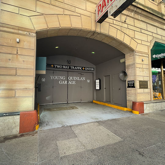 the building with the entrance/exit located on Ninth Street. The garage is